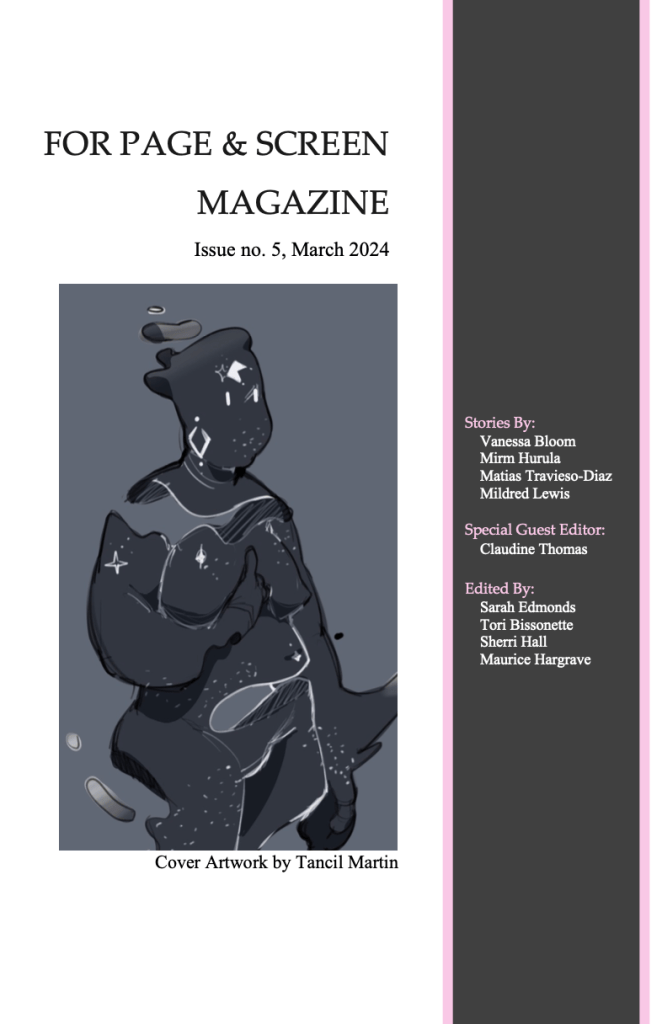 We want to offer our immense gratitude to everyone who made this issue possible. Thank you to all of the authors, screenwriters, and playwrights for your patience as we worked through some editorial roadblocks! Thank you to Tancil Martin, our amazing guest cover artist whose work we are proud to feature on our platform for the very first time! And a HUGE thank you to Claudine Thomas, our first-ever guest editor, for helping to make this issue what it is today! You all are amazing!