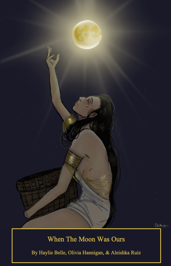 When The Moon Was Ours originally began as an optional class project offered by For Page & Screen’s EIC, Sarah Edmonds, to all their first-year writing students. The idea was to make reality any form of creative project the students wanted to pursue (from an essay collection to a one-act play, nothing was off the table) and thus give them experience in the “nitty-gritty” of what that production entailed. These three students, Haylie Belle, Olivia Hannigan, and Aleishka Ruiz, chose to join together to create a heartfelt collection of poetry and short stories—published digitally here and in hardcopy for the authors—and thus, When The Moon Was Ours was born.